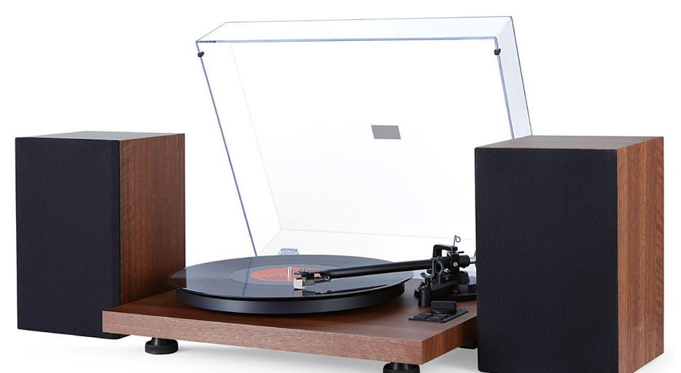The 1byone H004 is a belt-drive manual turntable system that includes a pair of 36-watt Bluetooth bookshelf speakers, designed as an all-in-one hi-fi vinyl playback solution with digital conversion capabilities.
